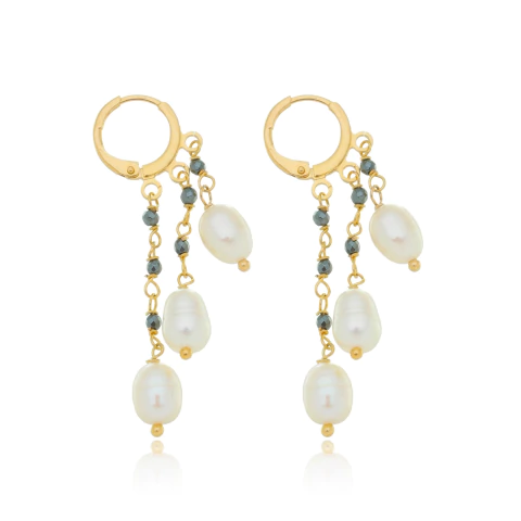 Brinco de argola composta com três fios degradê com micro pedras de hematita e pérolas naturais brancas. Fecho click. Disponível no banho de ouro amarelo 18K.